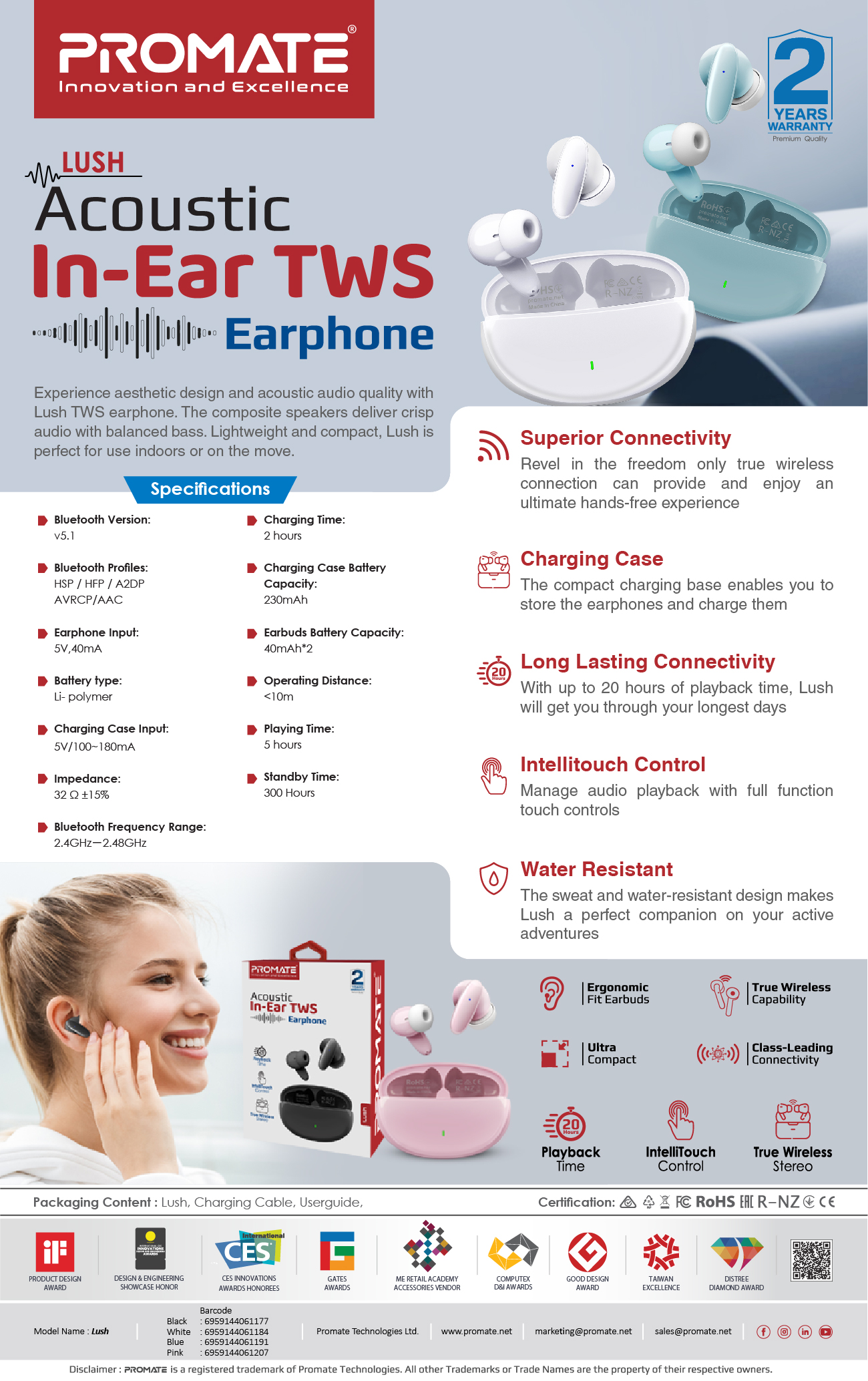أفضل وأقوى سماعات داخل الأذن ايربودز بتقنية Bluetooth v5.1، صوت عالي الدقة مع ميكروفون، مقاومة للماء بمعيار IPX5، وقت تشغيل يصل إلى 20 ساعة، تحكم ذكي باللمس واقتران تلقائي ذكي Promate Lush