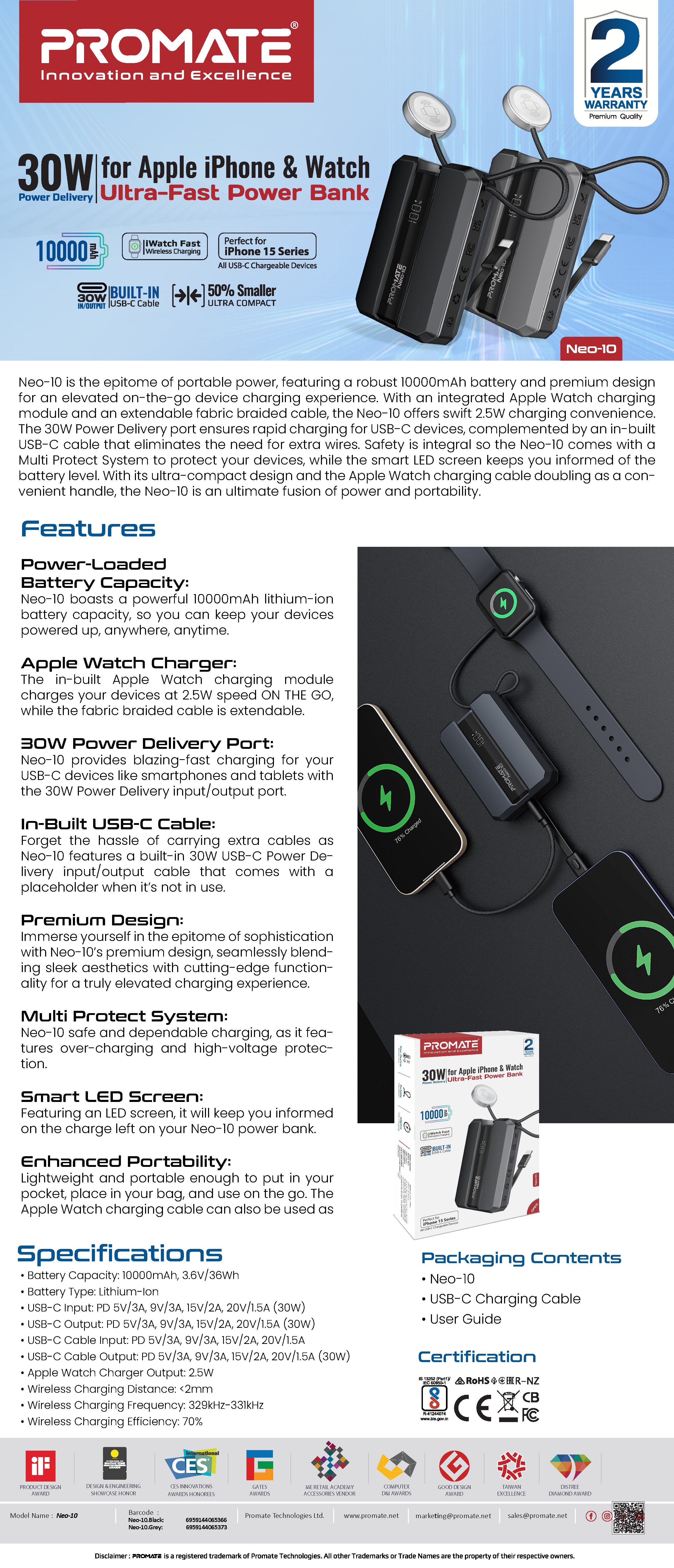 - نظام آمن ومتعدد الحماية: تعتبر السلامة أمرًا بالغ الأهمية مع Neo-10، الذي يتميز بنظام حماية متعدد شامل. من الشحن الزائد إلى الحماية من الجهد العالي، يضمن Neo-10 شحنًا آمنًا وموثوقًا لجميع أجهزتك، مما يمنحك راحة البال مع كل عملية شحن.
